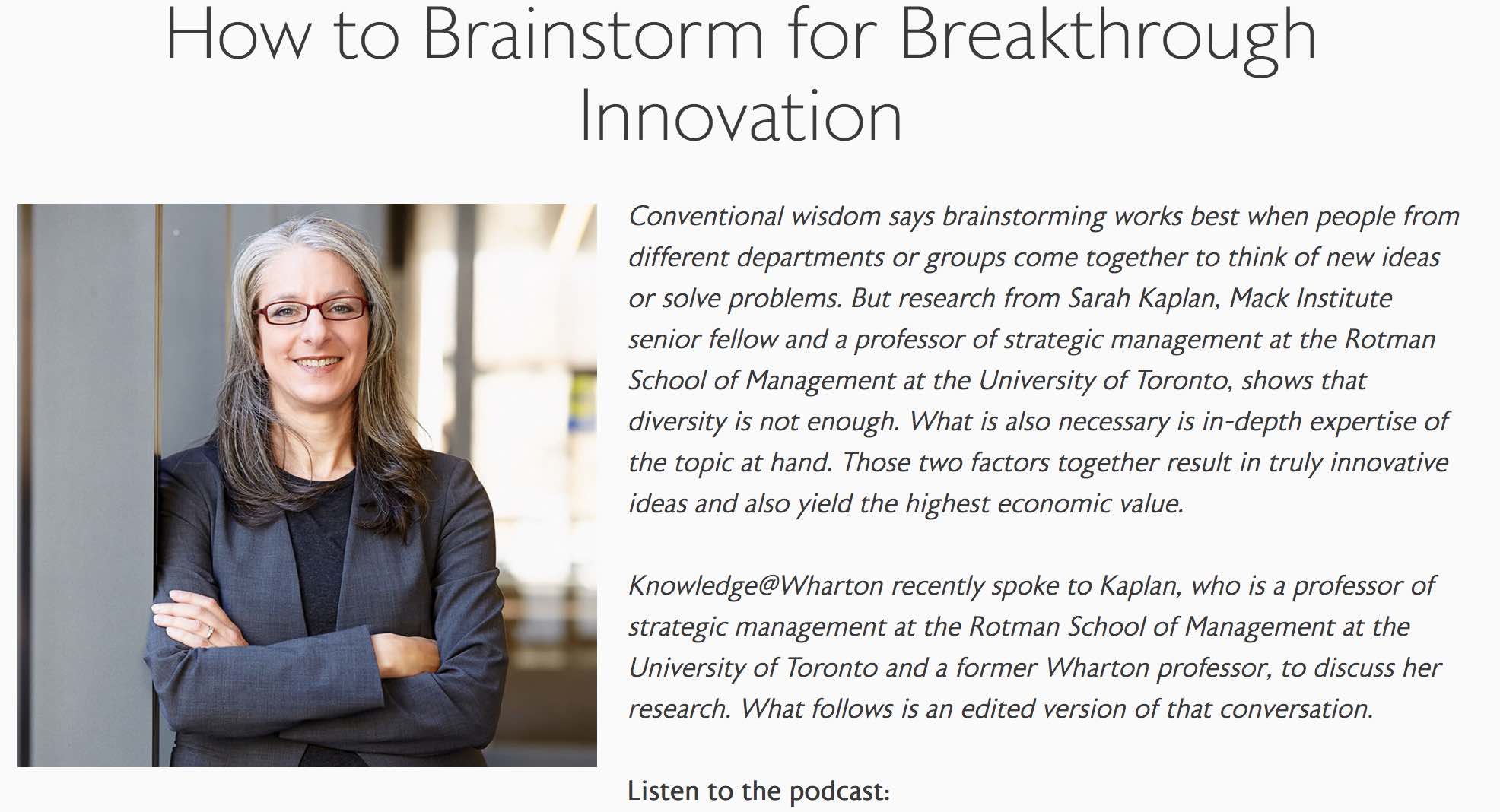 Sarah Kaplan appears in Knowledge@Wharton podcast series on how to achieve breakthrough innovation.
